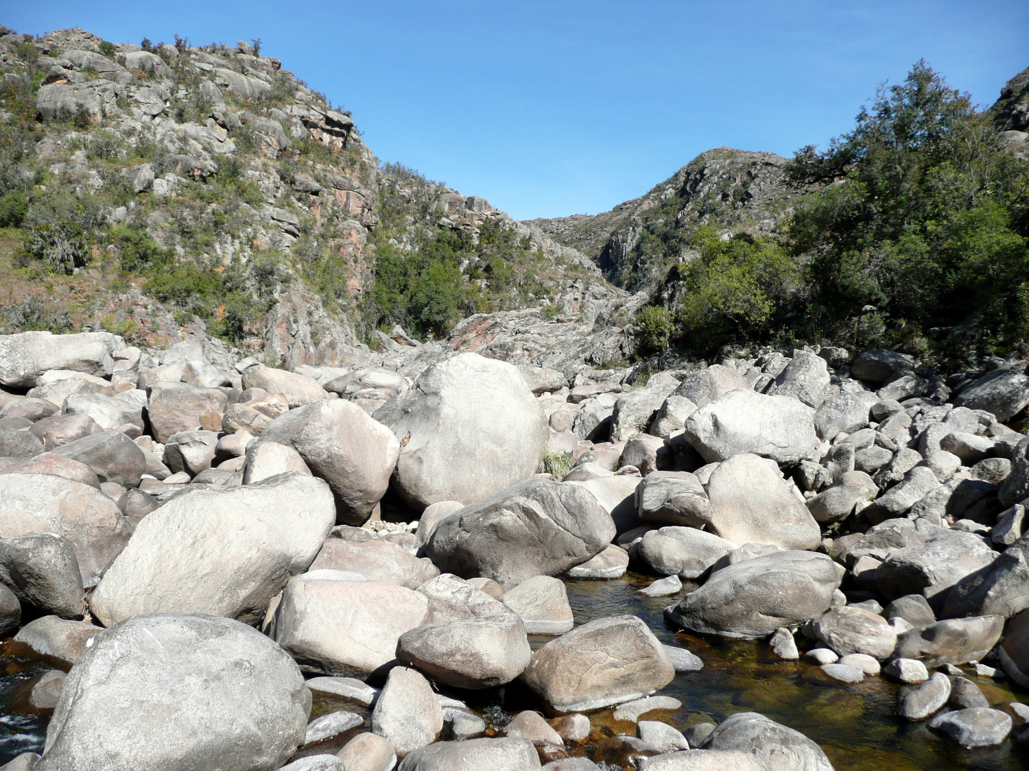 ![]() 20 Nous atteignons enfin les berges de la rivière, encombrées d'un fatras de blocs granitiques qui rendent la progression un rien acrobatique – un mince filet d'eau louvoie entre les rochers. |