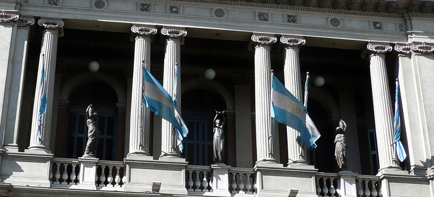 ![]() 2 Les bâtiments officiels pavoisent à qui mieux mieux. Ici, les bannières qui ne se sont pas emmêlées claquent au vent et rompent heureusement la rigide colonnade du Teatro San Martín. |