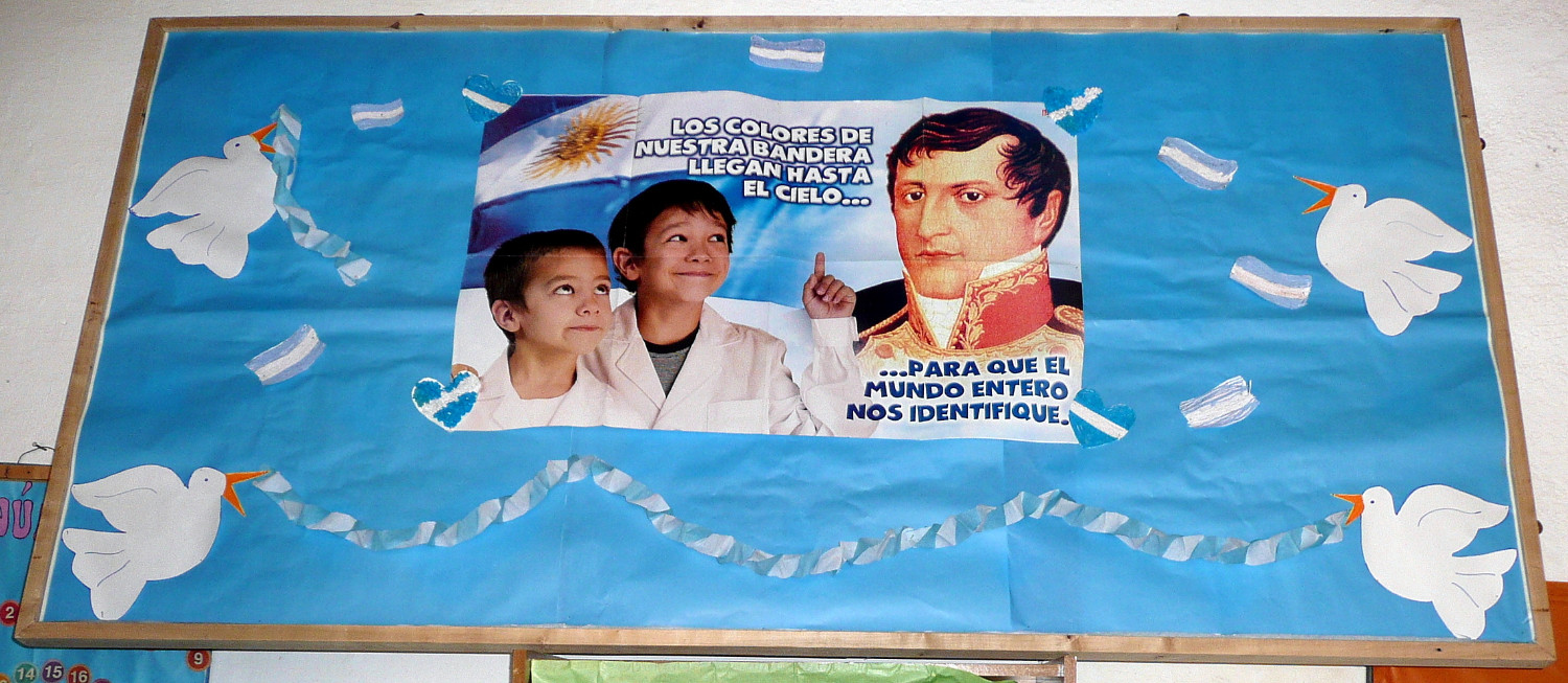 ![]() 12 Le thème du cours est écrit en capitales sanglantes : « Interdit de les oublier – elles ne sont pas négociables ». Qui ça, « elles » ? Les Malouines, pardi ! Leur profil déchiqueté n'est un mystère pour personne. |