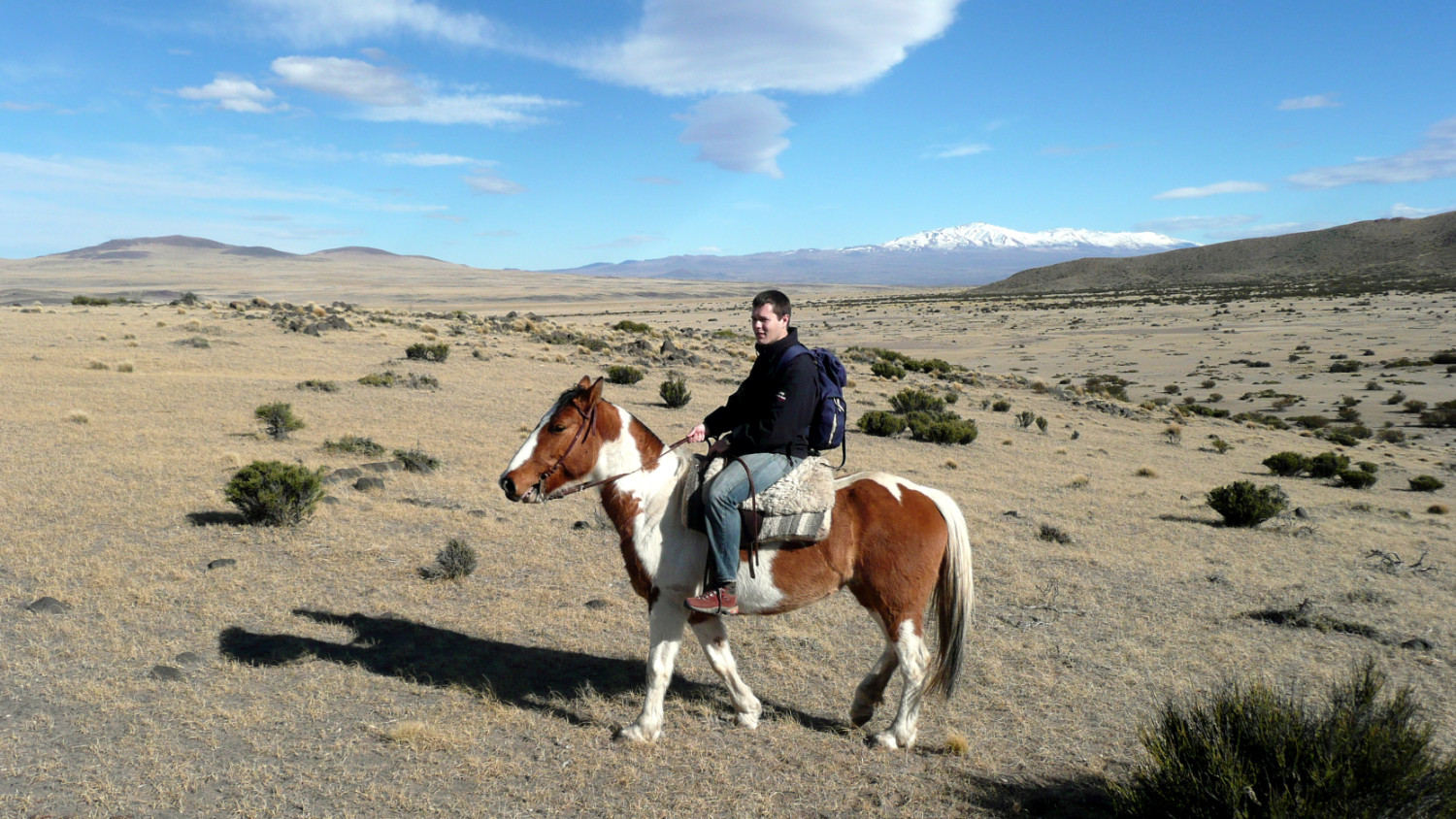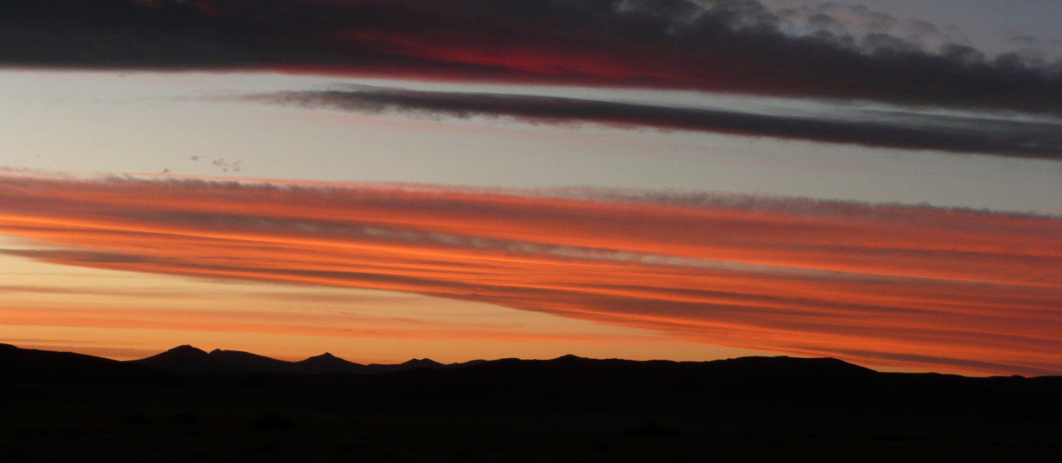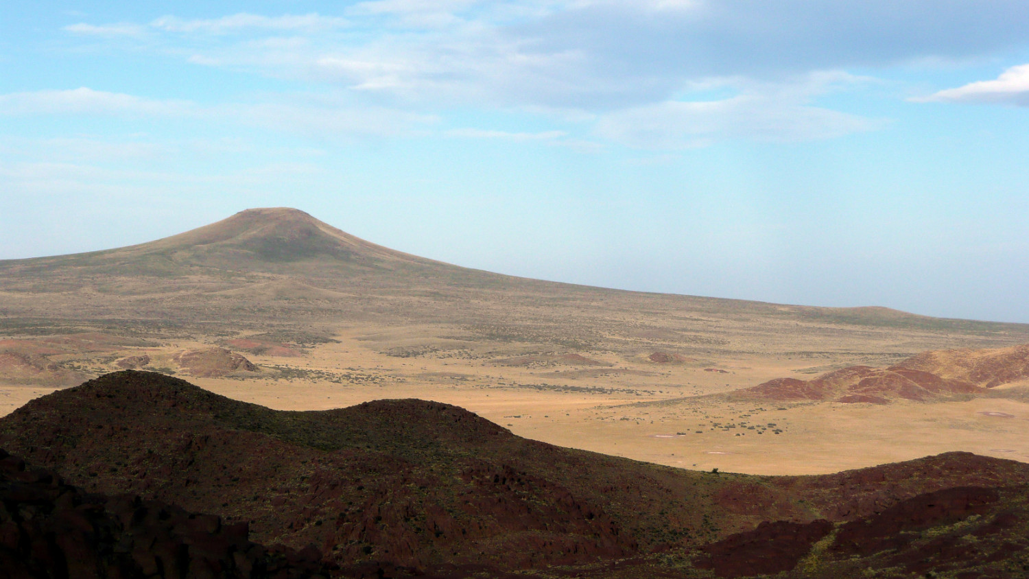 ![]() 11 Il offre depuis son sommet un aperçu panoramique sur la steppe que nous avons traversée pour venir jusqu'ici, vérolée de naevi volcaniques et tavelée d'éphélides végétales {j'aurais dû faire dermato}.1 1 Quelques palpitantes précisions toponymiques, pour ceux que ça passionne : au premier plan la Loma Quemada, au second plan le Cerro del Barreal, au fond je ne sais plus. |