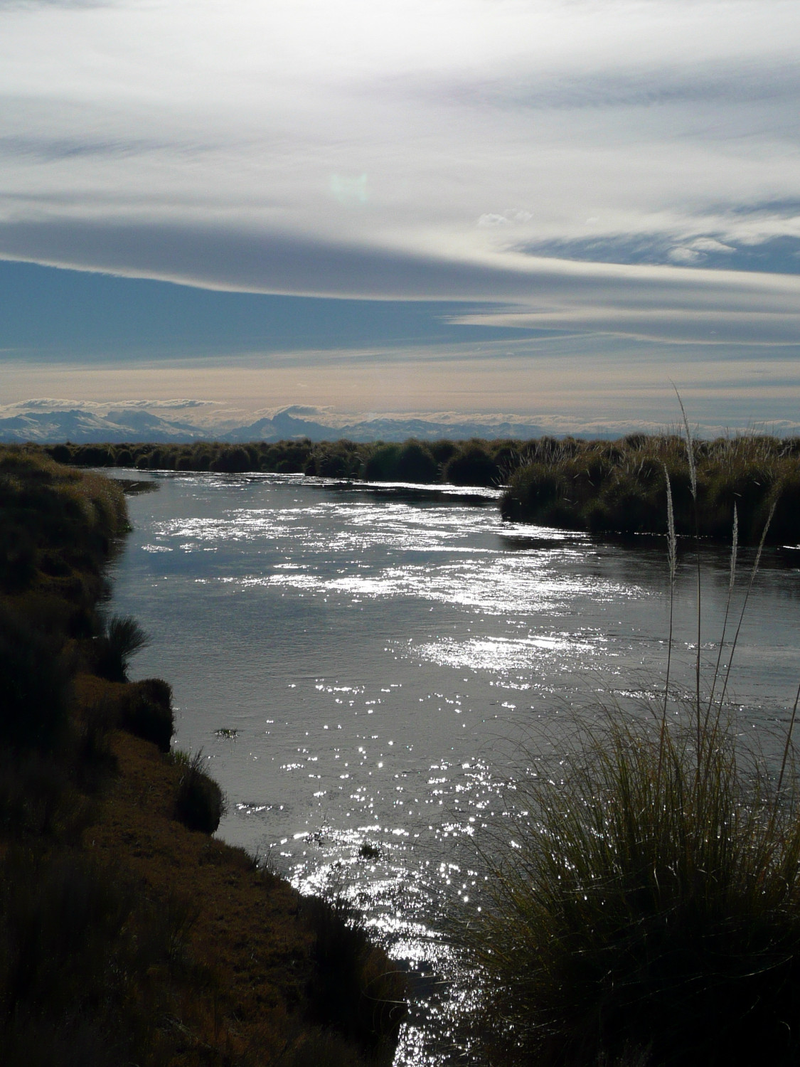![]() 65 La voici. Aldo, docte, nous documente : cette étendue livide est la Laguna de Llancanello, ceinte d'une auréole saline qui témoigne de l'extension maximale de sa fluctuante superficie et des marées capricieuses qui la régissent. |